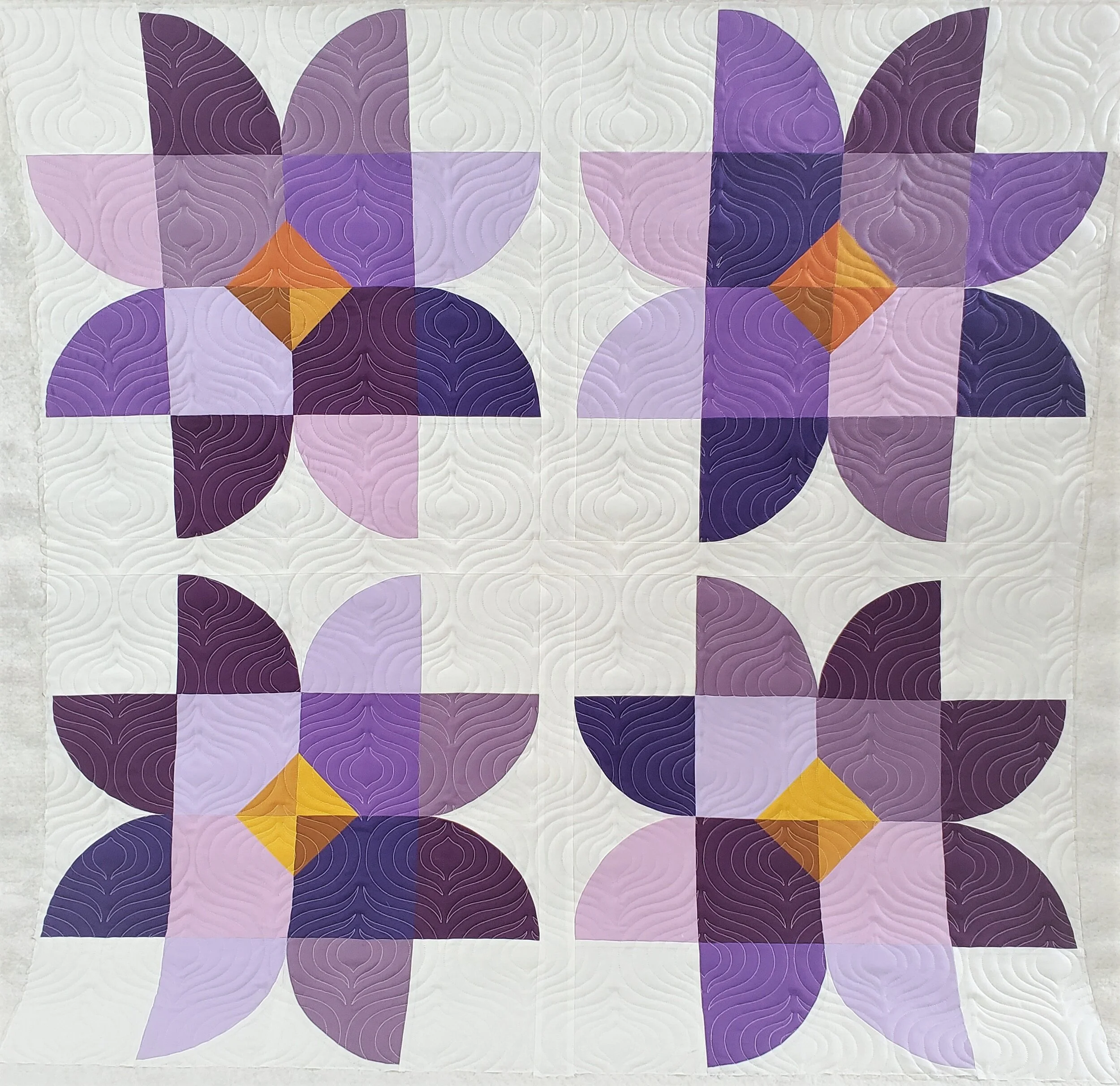 The first test quilt I made is the baby size. I used a bunch of solid purple and yellow fabrics I had in my stash. I quilted it using the andalusia pantograph and backed it in a lovely purple minky.
